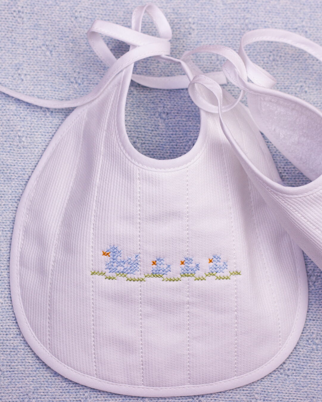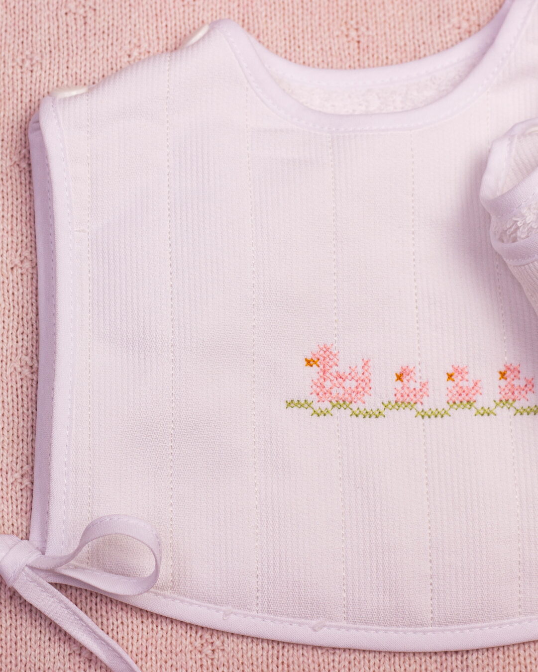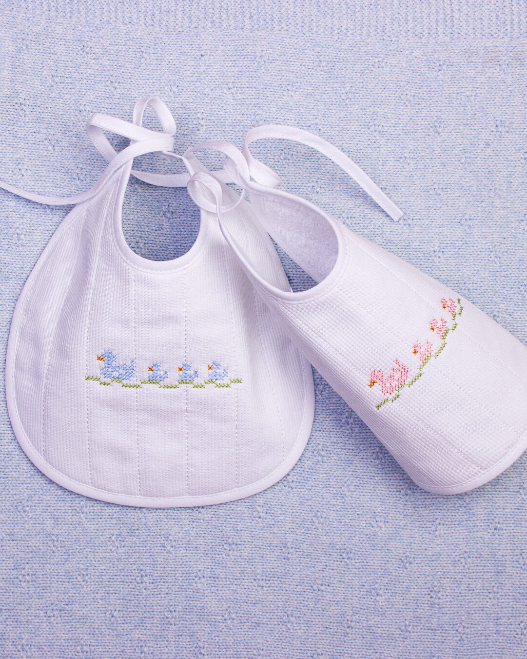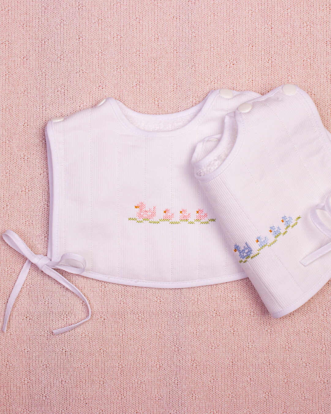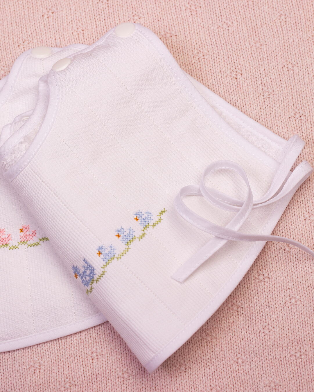 Babete redondo para bebé com bordado a ponto cruz ou com molas nos ombros e atilhos laterais