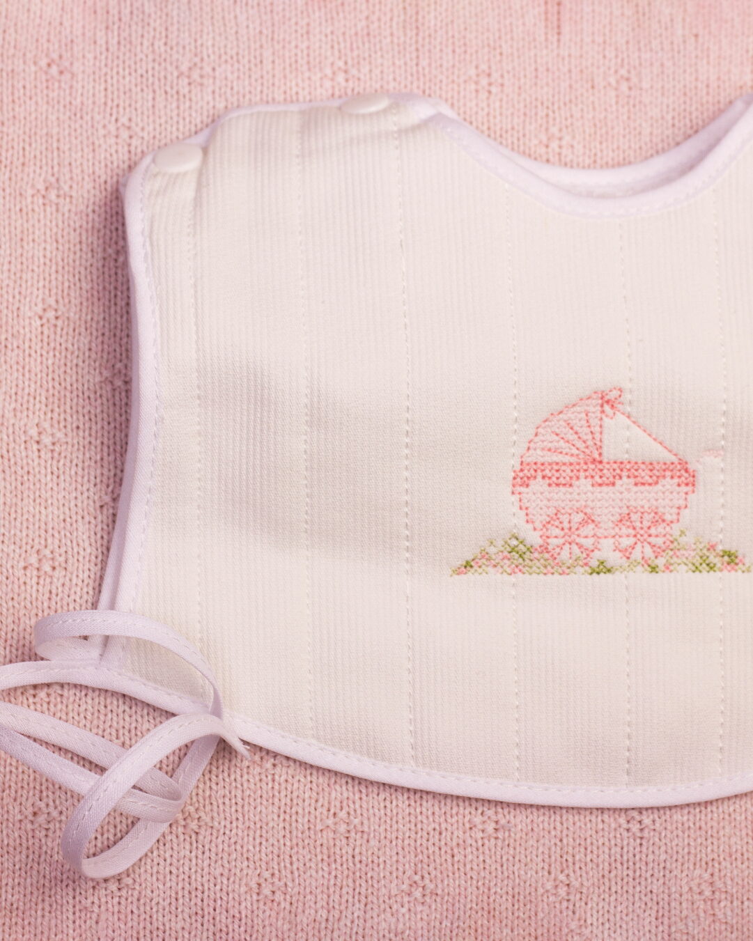 Babete com bordado a ponto cruz. Fecha com molas nos ombros e atilhos laterais